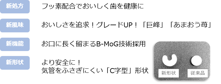 フッ素配合、新フレーバー、安心形状、新機能追加