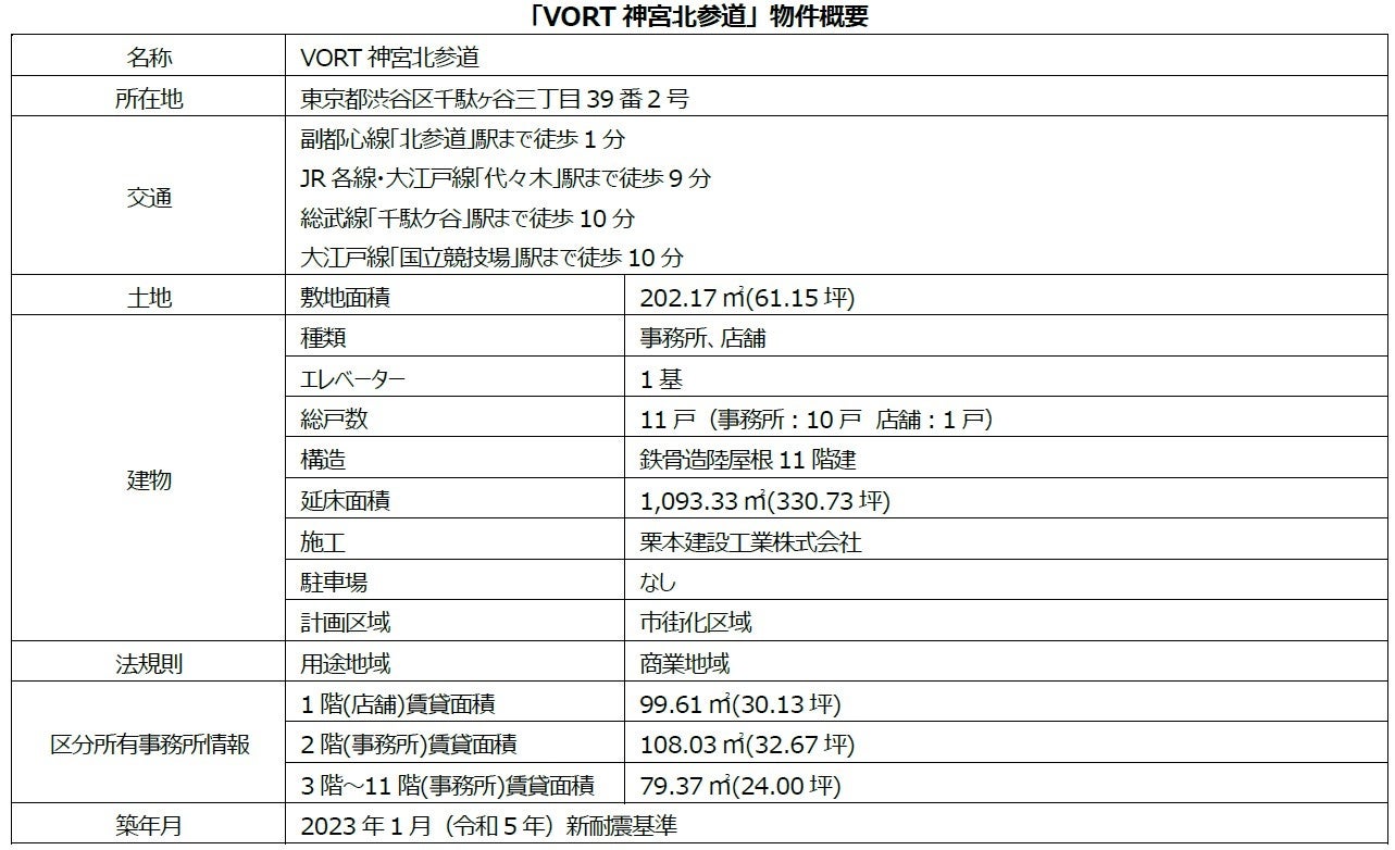 「区分所有オフィス®」を主軸に資産形成コンサルティングを行う株式会社ボルテックス(東京都千代田区 代表取締役社長 兼 CEO 宮沢 文彦、以下当社)は、「VORT神宮北参道」を取得しました。