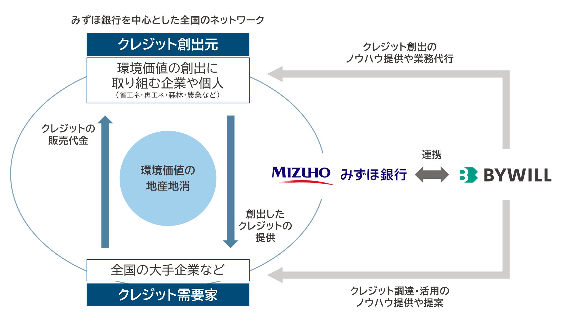 みずほ銀行は、バイウィルの環境価値に関する各種サービスに合致するニーズをもつ同行の取引先を、バイウィルに紹介して面談機会を設定する役割を担います。