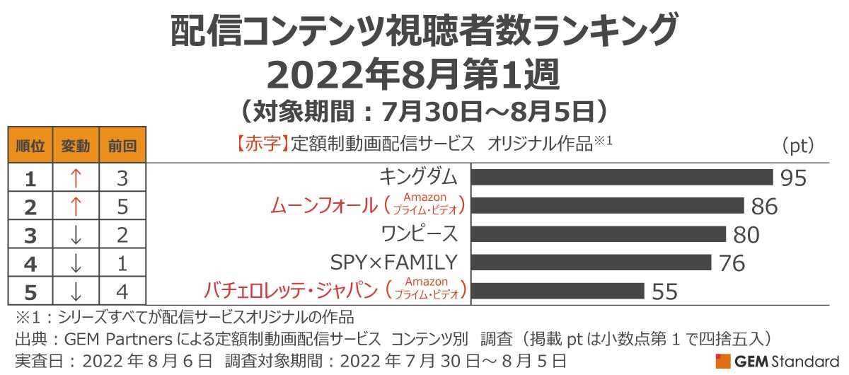 『キングダム』初の首位獲得、Amazonオリジナル好調『ムーンフォール』2位ほか~配信コンテンツ視聴者数ランキング(8月第1週)