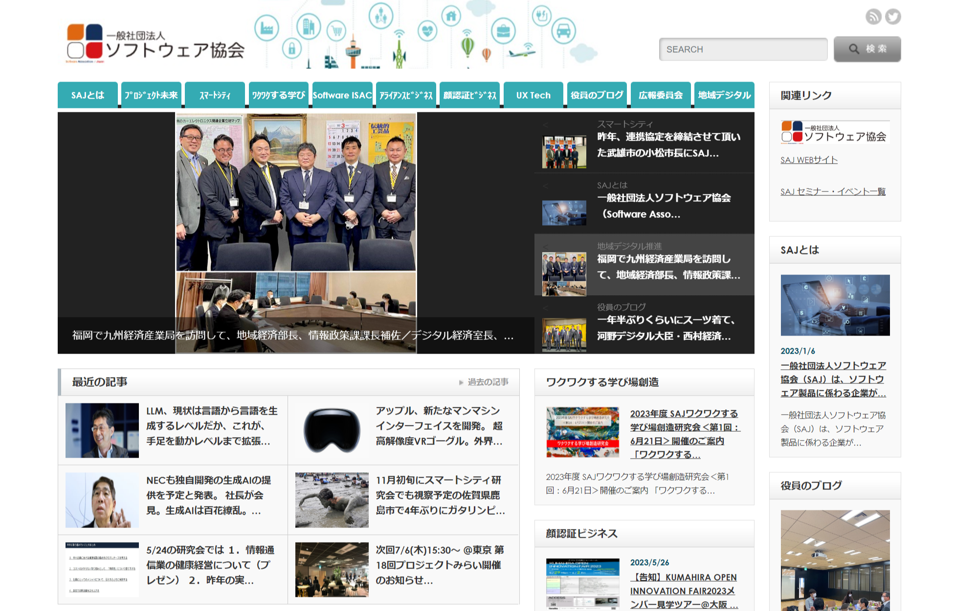 SAJの委員会・研究会は、国内ソフトウェア産業全体の活性化と課題解決を目的に、会員企業それぞれが持つ知見やノウハウを活かした活動が日々行われています。さらには、自治体や企業などのデジタルトランスフォーメーション(DX)の実現に向けた勉強や研究、セキュリティの啓発、さらにDX人材の確保や若手の育成など多岐にわたり、研究と情報発信を展開しています。これら各委員会・研究会が行っている日々の活動を広く公開することで、ソフトウェア産業従事者だけでなく、ソフトウェアの利用者である全産業に向けて、SAJの存在意義をご理解、ご賛同いただき、多くの企業にご入会いただきたいと考えています。