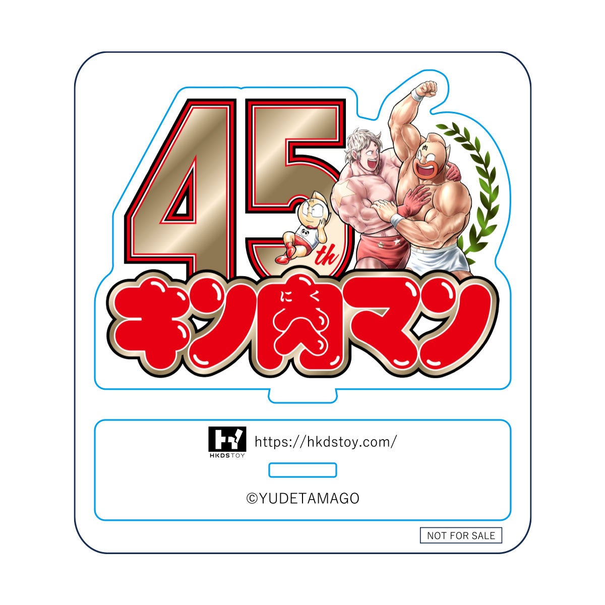今回、キン肉マン公式オンラインストア KIN29.COM 限定のご予約特典として、ノベルティ「キン肉マン原作45周年記念ロゴアクリルスタンド」(組み立て時高さ約70mm)を付属します。