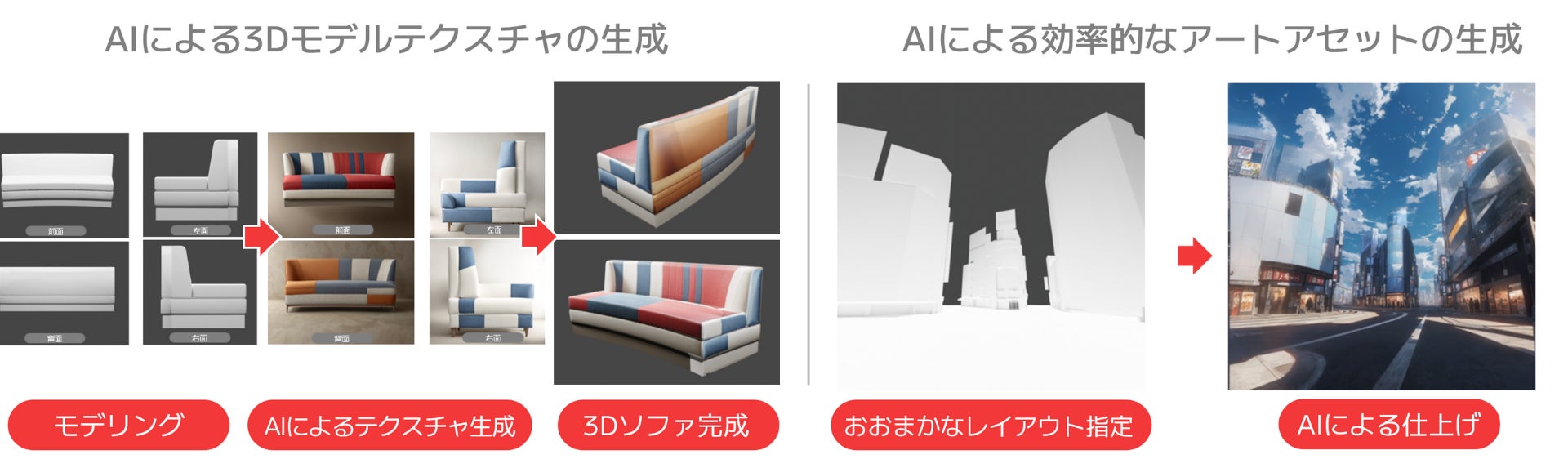 ゲーム・アニメ、映像制作など、大量のデザインアセットを作成する必要のあるクリエイティブな業種へ向けて、ワークフローに生成AIを導入し、業務効率を劇的に改善させる支援を行います。著作権処理された学習データをベースに、コンテンツ固有のデータを追加学習し、3Dモデルやテクスチャから、映像、アニメーションに至るまで、自動的に生成できるAI生成ワークフローを構築、導入支援します。