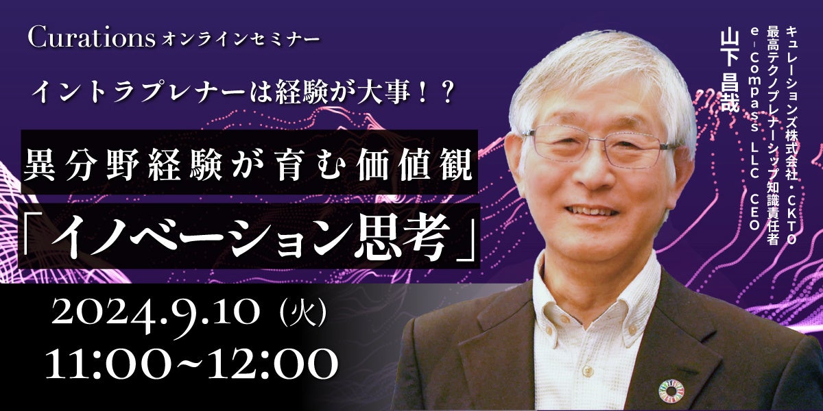 顧客企業のビジネス変革を成功に導くキュレーションズ株式会社(本社:東京都渋谷区、代表取締役社長:根本隆之、以下当社)は、『イントラプレナーは経験が大事!?異分野経験が育む価値観「イノベーション思考」』を2024年9月10日(火)に開催いたします