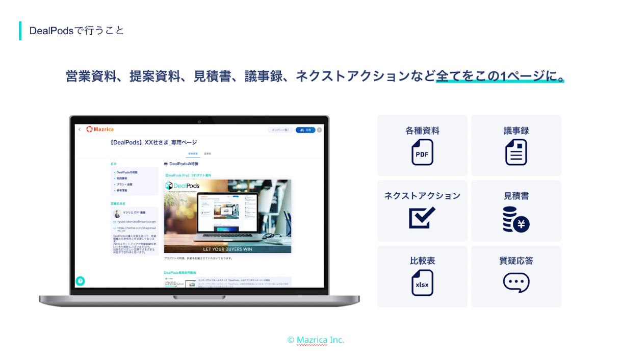 また、私自身もDealPodsの提案を受けているなかで、いち顧客としてDealPodsを介したコミュニケーションを体験してみてそのスムーズさ、タスク・役割・スケジュールが常に明瞭になることが実感でき、より魅力的に感じました。