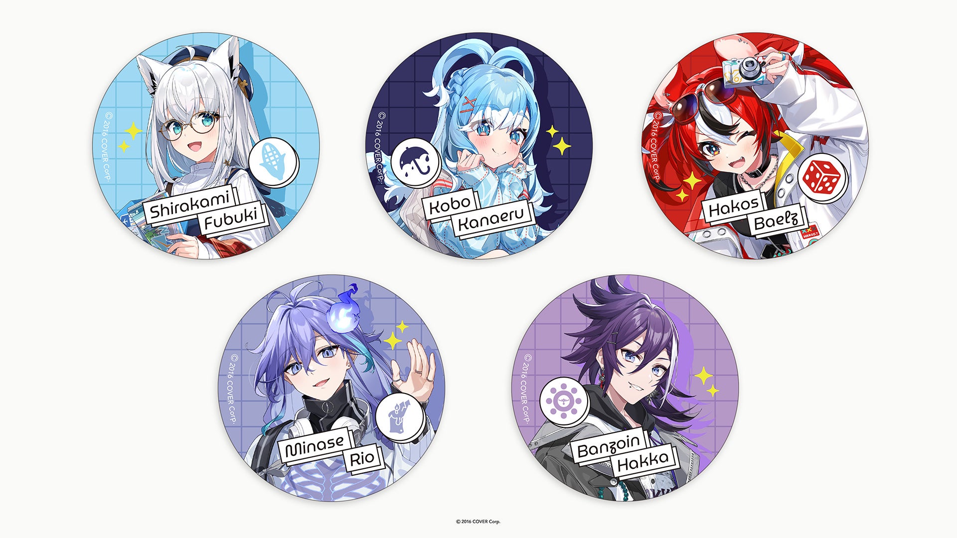 hololive Meet用に描き下ろされたビジュアルから、アンバサダーたちの姿を配置したトレーディング缶バッジ。5名の中からランダムで1名が登場するトレーディング商品となります。