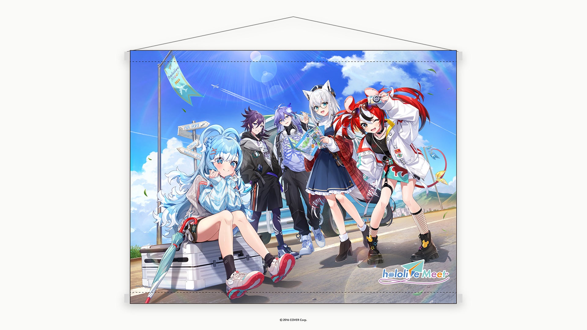 旅中のアンバサダーたちから送られてきた記念写真のような『hololive Meet』の描き下ろしキービジュアルをB2サイズのタペストリーにしました。
