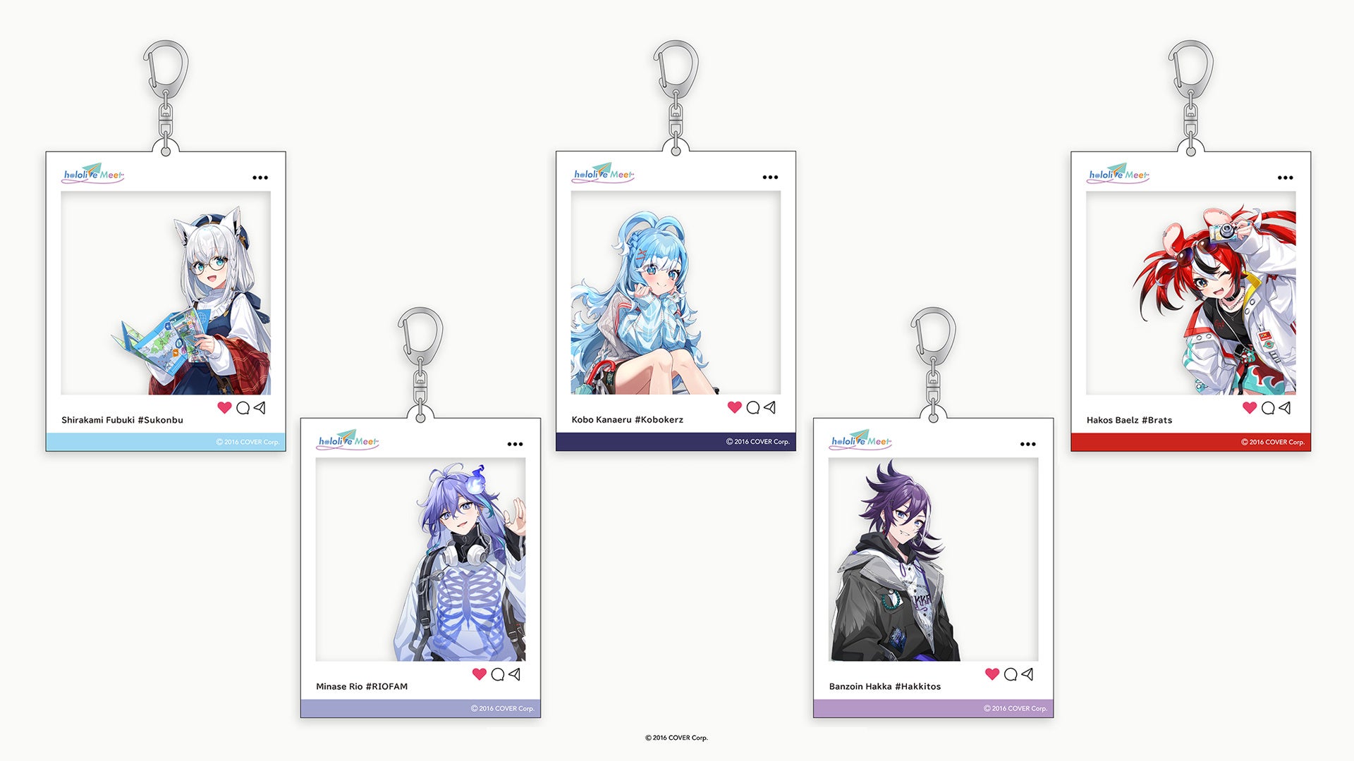 SNSのフレーム⾵にデザインされたキーホルダーです。透明部分に参加イベント⾵景やお気に⼊りの景⾊を⼊れると、アンバサダーと⼀緒に写真を撮ることができる『hololive Meet』らしいグッズとなっております。