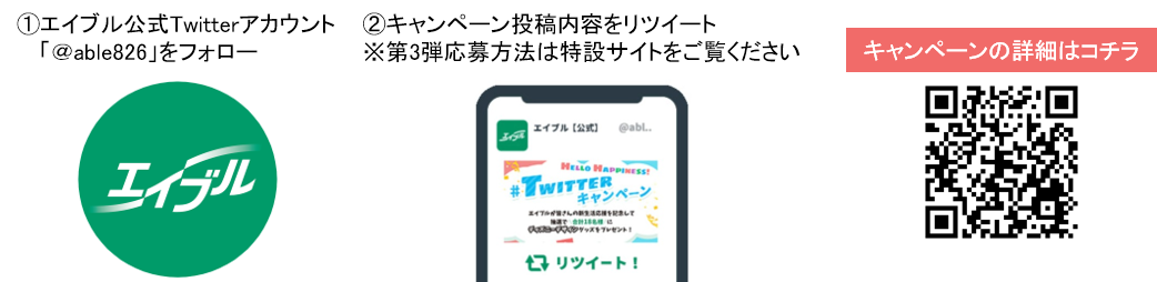 ■実施期間:第1弾:2023年6月26日~2023年6月30日 第2弾:2023年7月17日~2023年7月21日 第3弾:2023年8月7日~2023年8月11日 ■応募条件:①エイブル公式Twitterアカウント(https://twitter.com/able826)をフォローしていること ②実施期間内にキャンペーン投稿内容をリツイートしていること ※第3弾の応募条件については、特設サイトをご覧ください ■当選発表:当選者の方にのみ各キャンペーン終了日の1ヵ月後を目途に、 順次Twitterのダイレクトメッセージにてご連絡いたします。 ■留意事項:特設サイトよりご確認ください。 https://www.able.co.jp/campaign/hello-happiness/2023-sns-campaign/ |