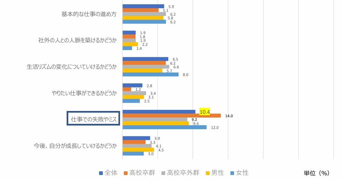 属性別について、高校卒群/高校卒外群では「仕事に対する現在の自分の能力・スキル」では高校卒外群の方が、「上司・同僚など職場の人とうまくやっていけるか」「仕事での失敗やミス」では高校卒群の方がそれぞれ約5.0pt大きくなっています。性別では大きな差は見受けられませんでした。