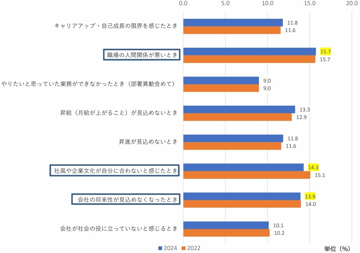 7.転職を考えるシチュエーションの第1位は「職場の人間関係が悪いとき」で15.7%、第2位は「社風や企業文化が自分に合わないと感じたとき」で14.3%