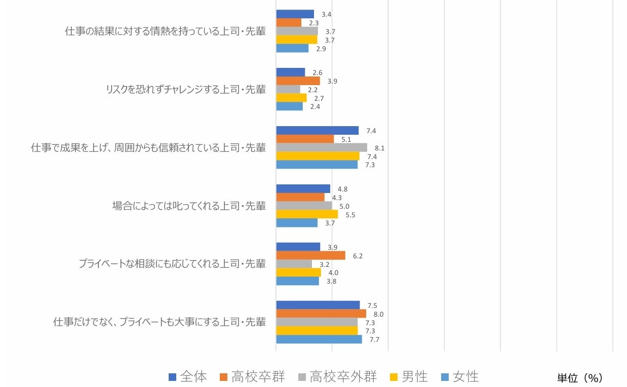 第4位の「言動が一致している上司・先輩」は男性7.4%、女性16.1%で、2倍以上のポイント差があります。女性の方が「言動が一致している上司・先輩」をより重視している傾向にあると考えられます。