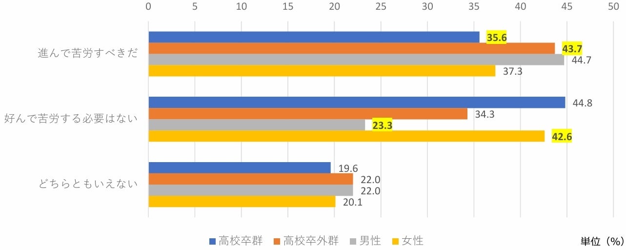 属性ごとにみてみると、高校卒外群は高校卒群より「進んで苦労すべきだ」」が8.1pt高くなっています。