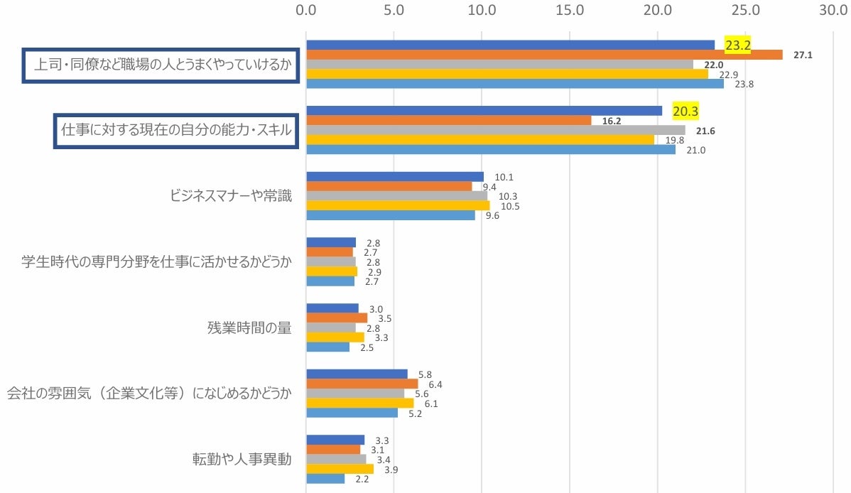 仕事をしていく上での不安について尋ねたところ、第1位は「上司・同僚など職場の人とうまくやっていけるか」で23.2%、第2位は「仕事に対する現在の自分の能力・スキル」で20.3%、第3 位は「仕事での失敗やミス」で10.4%でした。