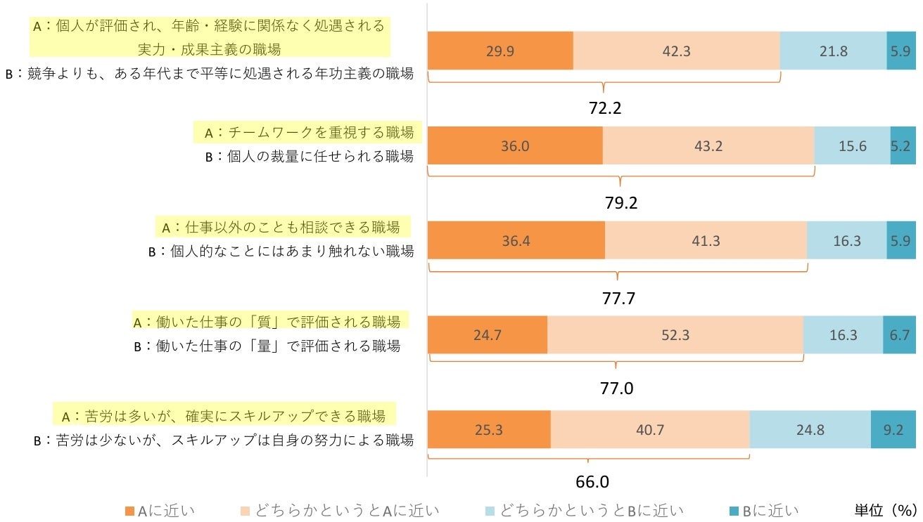 新入社員に働きたい職場について、5つの設問で方向性を尋ねたところ、実力・成果主義/年功主義では「個人が評価され、年齢・経験に関係なく処遇される実力・成果主義の職場」が全体の72.2%、チームワーク重視/個人裁量重視では「チームワークを重視する職場」が全体の79.2%、アットホーム/ビジネスライクでは「仕事以外のことも相談できる職場」が全体の77.7%、評価軸は仕事の「量」/評価軸は仕事の「質」では「働いた仕事の「質」で評価される職場」が全体の77.0%、業務の中でスキルアップ/業務の外でスキルアップについては「苦労は多いが、確実にスキルアップできる職場」が全体の66.0%となりました。