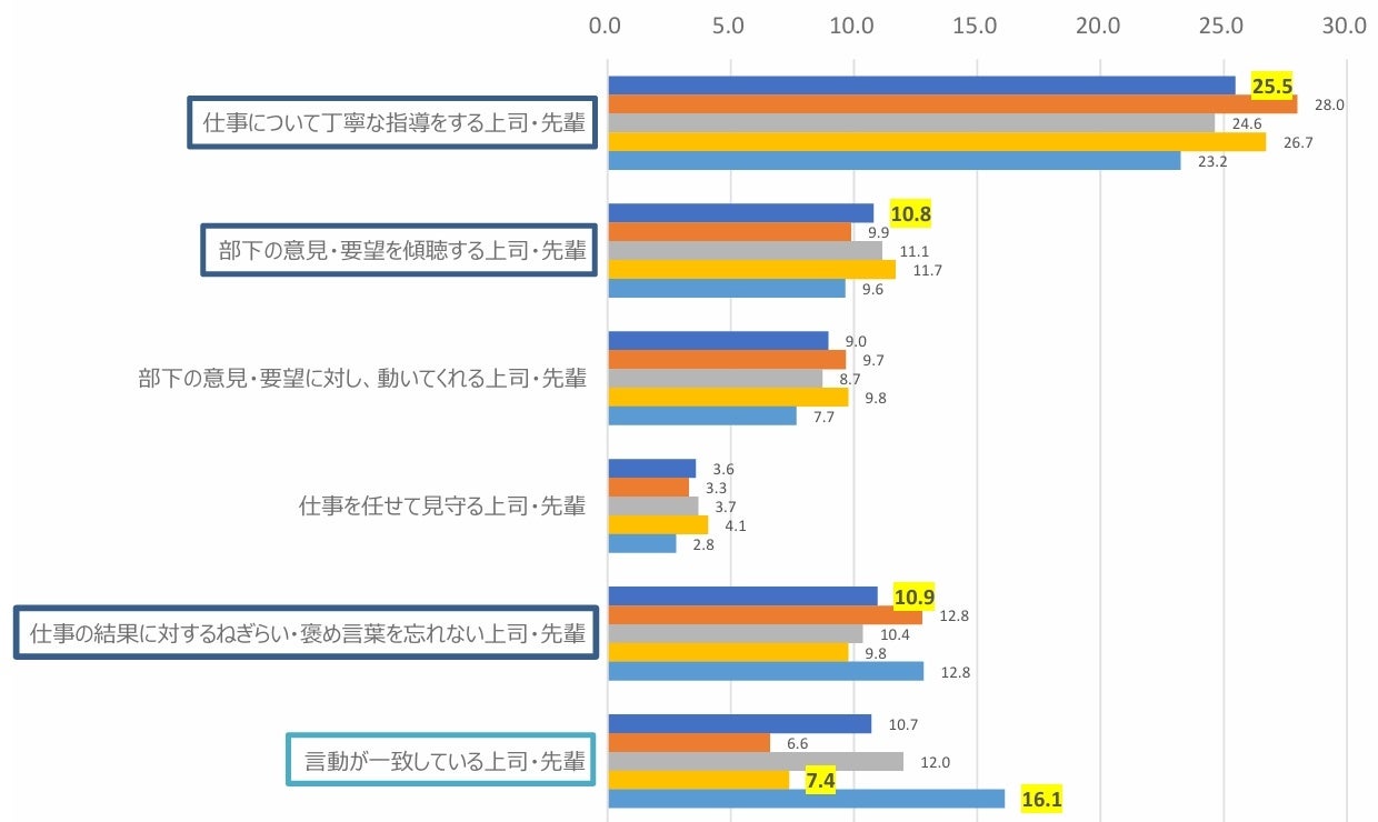 理想的だと思う上司・先輩について尋ねたところ、第1位は「仕事について丁寧な指導をする上司・先輩」で25.5%、第2位は「仕事の結果に対するねぎらい・褒め言葉を忘れない上司・先輩」で10.9%、第3位は「部下の意見・要望を傾聴する上司・先輩」で10.8%でした。いずれの項目でも属性別に大きな差はありませんでした。
