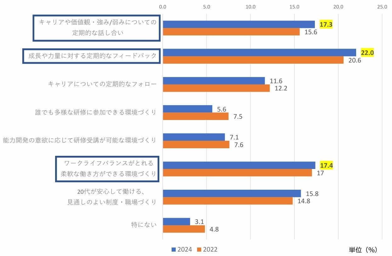 自身の成長に向けて、上司・人事へ期待することについて尋ねたところ、第1位は「成長や力量に対する定期的なフィードバック」で22.0%、第2位は「ワークライフバランスをとれる柔軟な働き方ができる環境づくり」で17.4%、第3位は「キャリアや価値観・強み/弱みについての定期的な話し合い」で17.3%となりました。経年別での大きな変化は見られませんでした。
