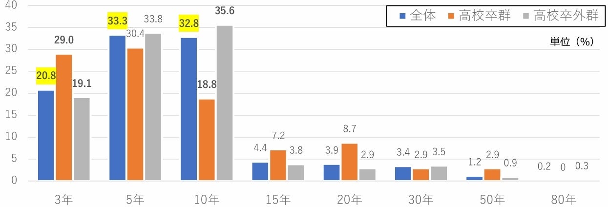 「将来のキャリアイメージを描いている」の詳細を見ていくと、3年後までキャリアイメージを描いている人は20.8%、3年後までキャリアイメージを描いている人は33.3%、3年後までキャリアイメージを描いている人は32.8%となりました。属性別に見ていくと、3年後までは高校卒群の方がポイントが高く、それ以上は高校卒外群の方がポイントが高くなりました。