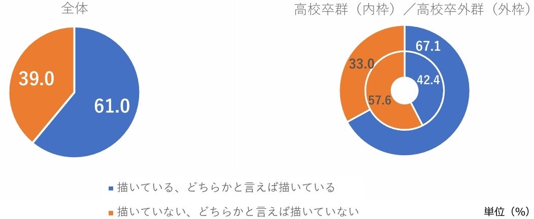将来のキャリアイメージについて尋ねたところ、全体の61.0%が「将来のキャリアイメージを描いている」(描いている+どちらかと言えば描いている)と回答しました。属性別に見ていくと、高校卒外群は高校卒群より24.7pt「将来のキャリアイメージを描いている」が高くなりました。