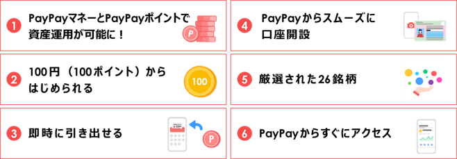 2022年8月には、PayPayアプリ上で有価証券の取引ができる「PayPay資産運用」の提供を開始。PayPayマネーとPayPayポイントを使い100円(100ポイント)からETF・投資信託あわせて26銘柄の取引ができます。
