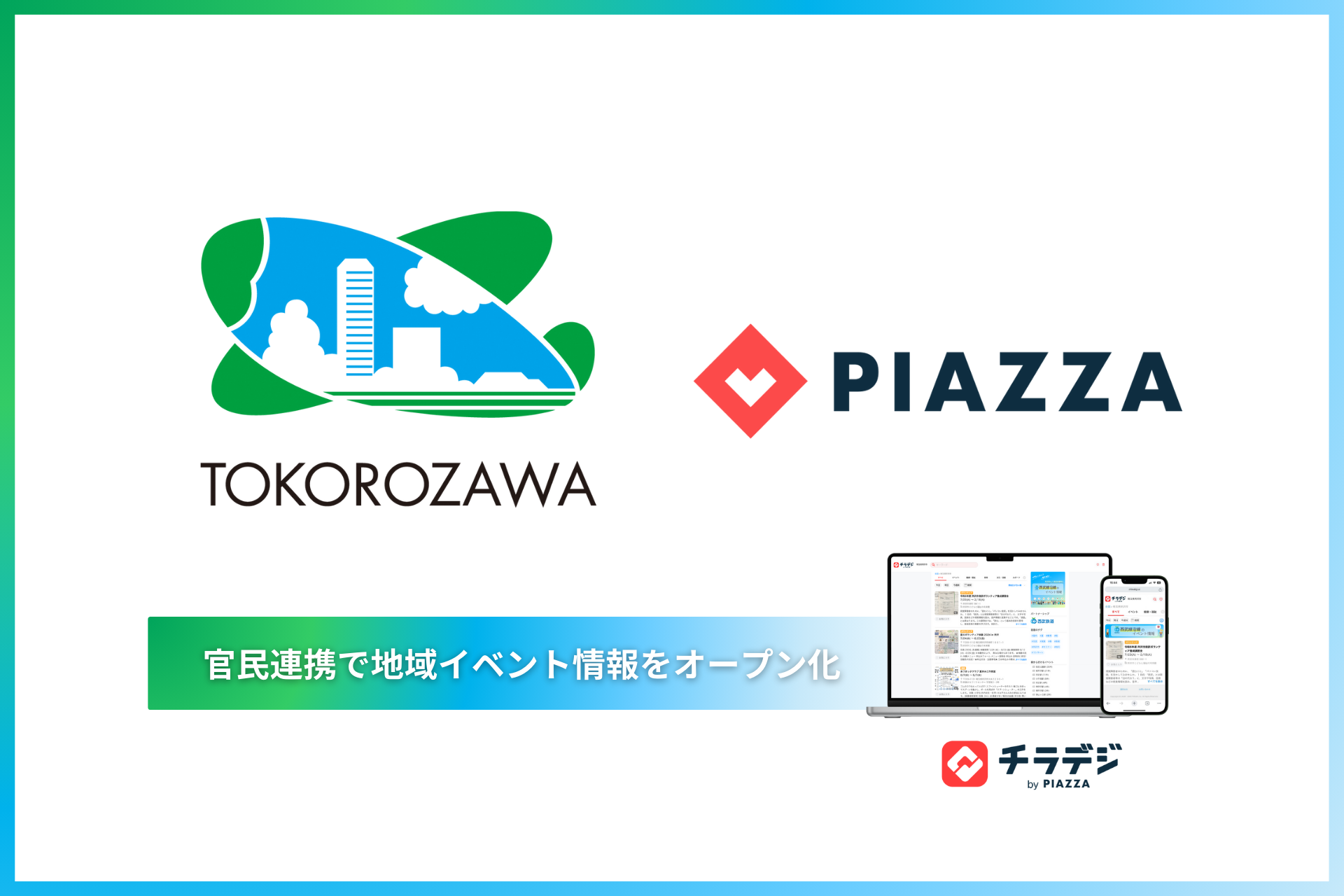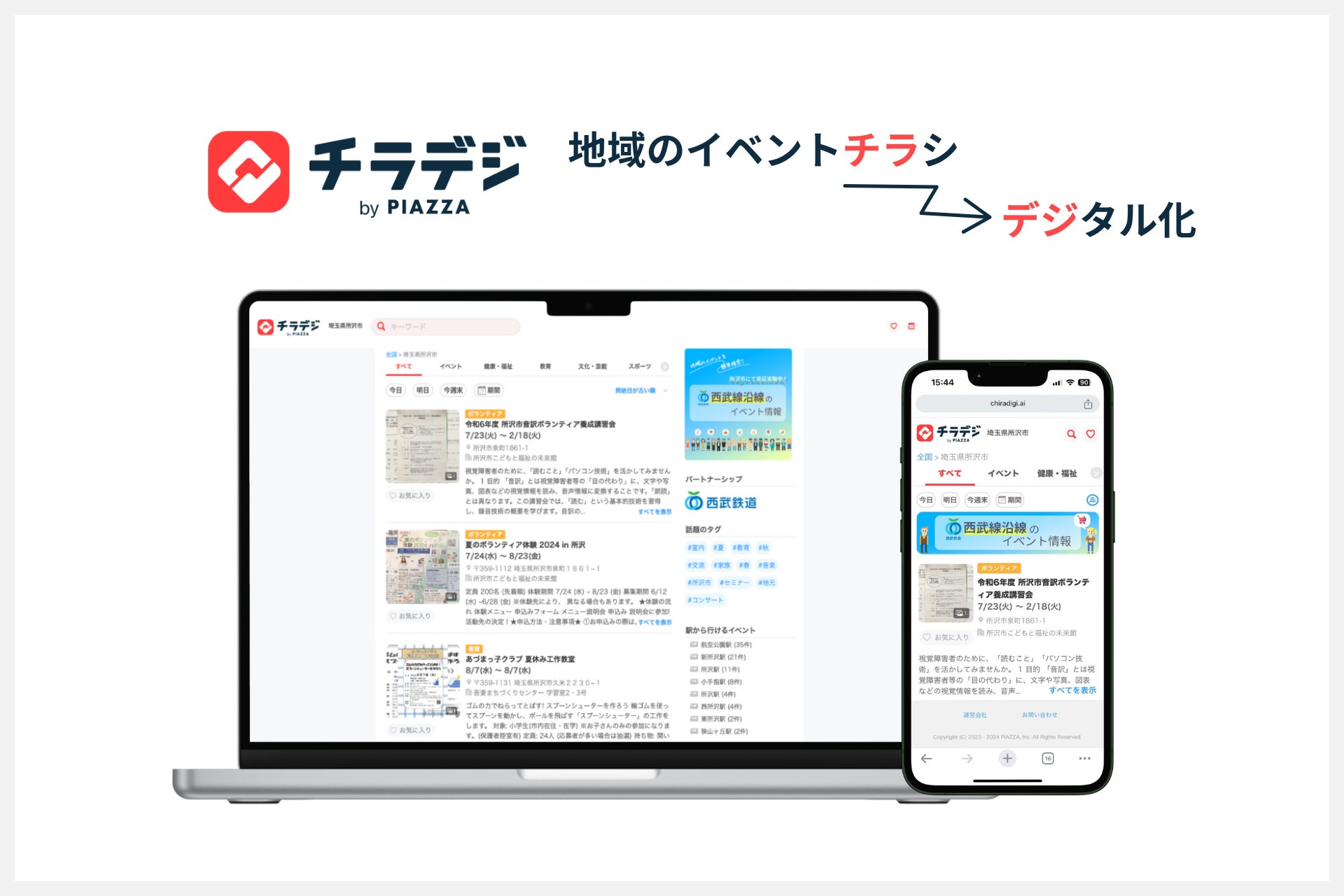 自治体や地域団体、町内会などが開催する地域のイベント情報は、主にポスターやチラシなどの紙媒体で告知され、情報の拡散性に課題がありました。PIAZZAは西武鉄道株式会社と連携し、地域のにぎわい創出および西武線沿線の地域活性化を図るため、地域のイベント情報をデジタルで一元管理する「チラデジ」を活用した取り組みを2024年3月より開始しています。その第1弾として、西武鉄道が本社を置く所沢市内のイベント情報を「チラデジ」サイト( https://chiradigi.ai/saitama_tokorozawa )にて発信してまいりました。今回、本サイト内における所沢市の地域イベント情報をさらに充実させ、イベント参加を通じた外出・交流機会を促進し地域の活性化を図ることを目的に、所沢市とPIAZZAが連携する運びとなりました。