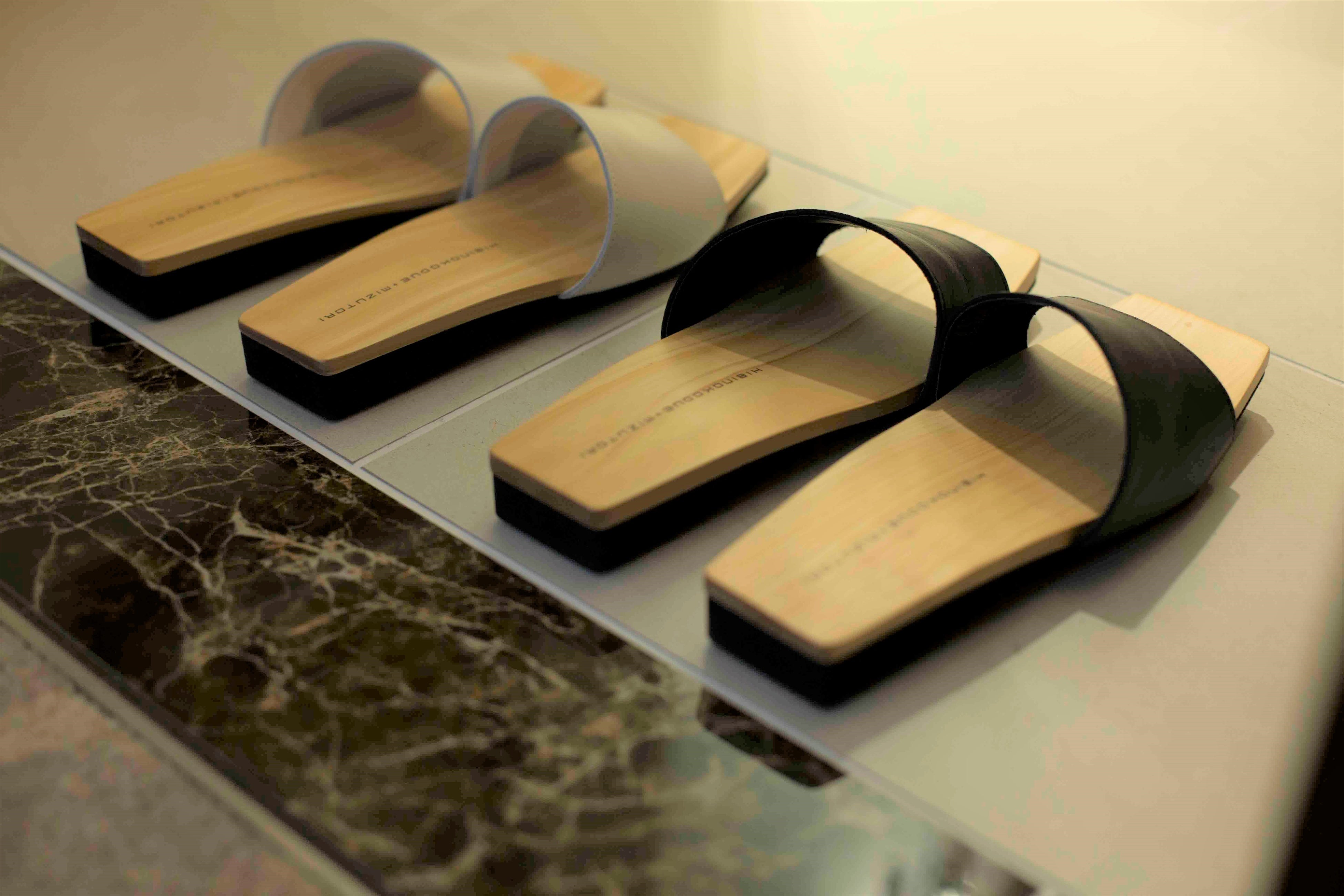 伝統を大切に守りながら進化させ、日本の新しい生活文化を提案している下駄メーカー「mizutori」の木製スリッパを導入。従来のパイルスリッパと併用し、ゴミ削減を目指しています。