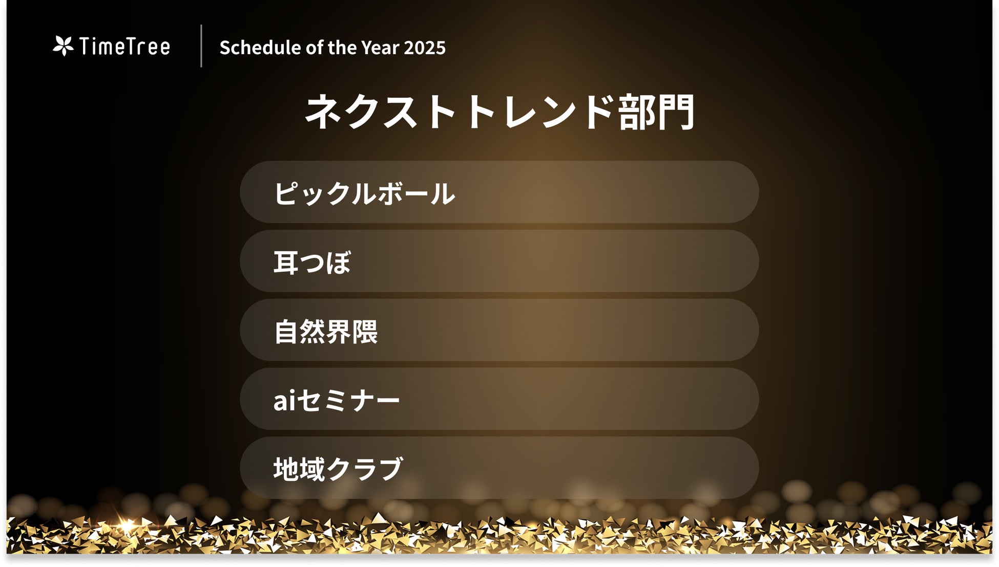 最後に、TimeTree未来総研がジャンルを限らず、次に来るトレンド予定をピックアップした「ネクストトレンド部門」では、「ピックルボール」「耳つぼ」「自然界隈」「aiセミナー」「地域クラブ」の5つを選出しました。