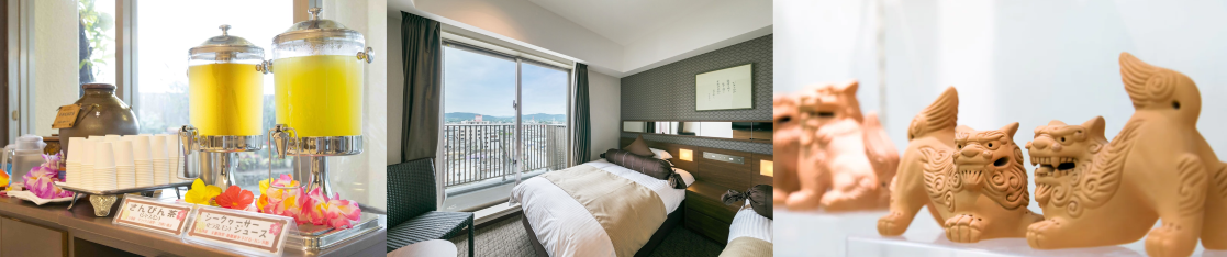 石垣空港から車で約25分、他の離島への玄関口でもある石垣島離島ターミナルのすぐ近くに位置しています 部屋は落ち着いたインテリアで統一されており、ゆっくりとリラックスすることができます。沖縄らしさを感じるウェルカムドリンクが提供されるロビーや、レモングラスやシークワーサーなど季節に応じて変わる香りを楽しめる大浴場などに加え、キッズスペースも完備しており、お子様連れでも安心して楽しめます。