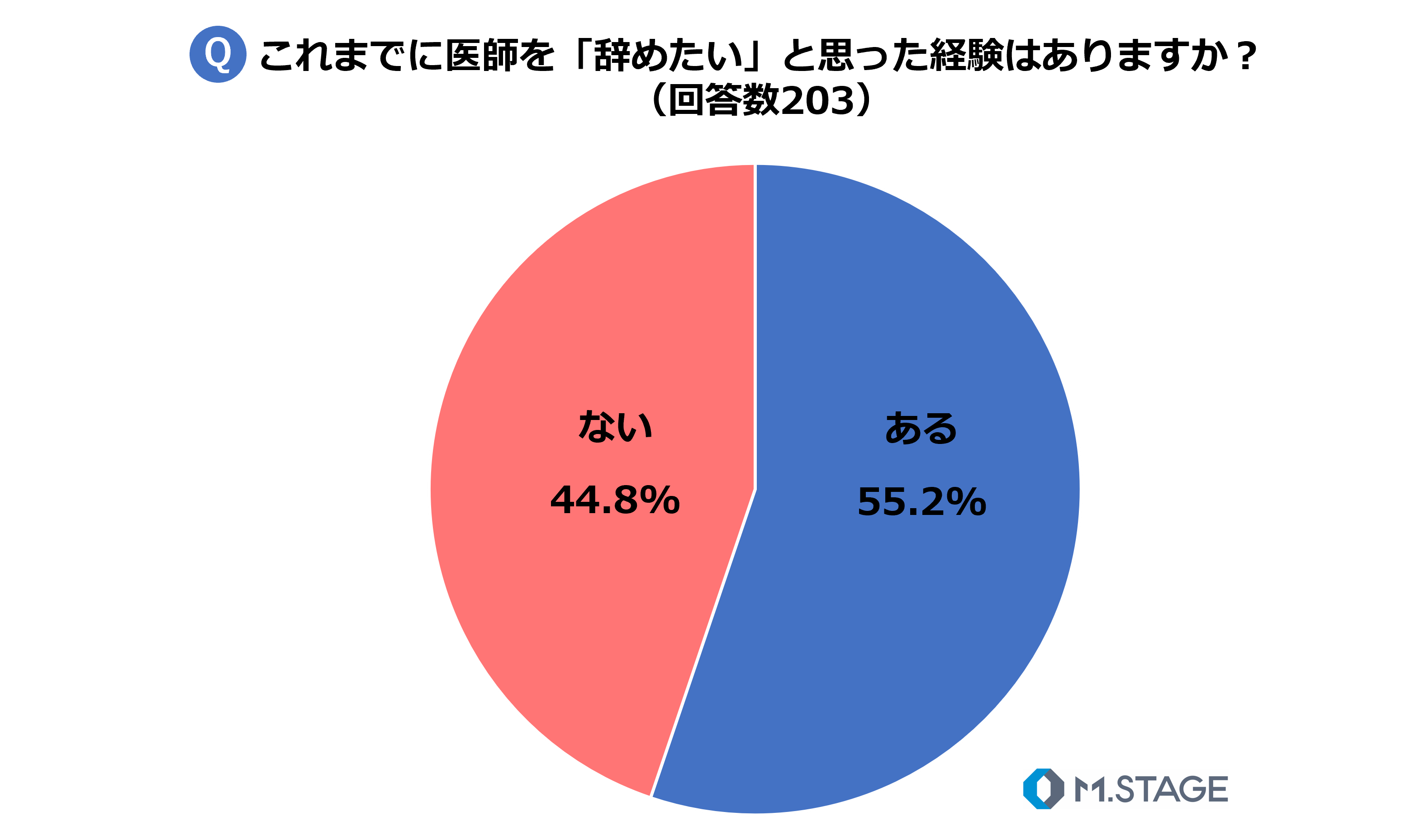 これまでに、医師を「辞めたい」と思った経験があるかについて質問したところ、55.2%が「ある」と回答しました。
