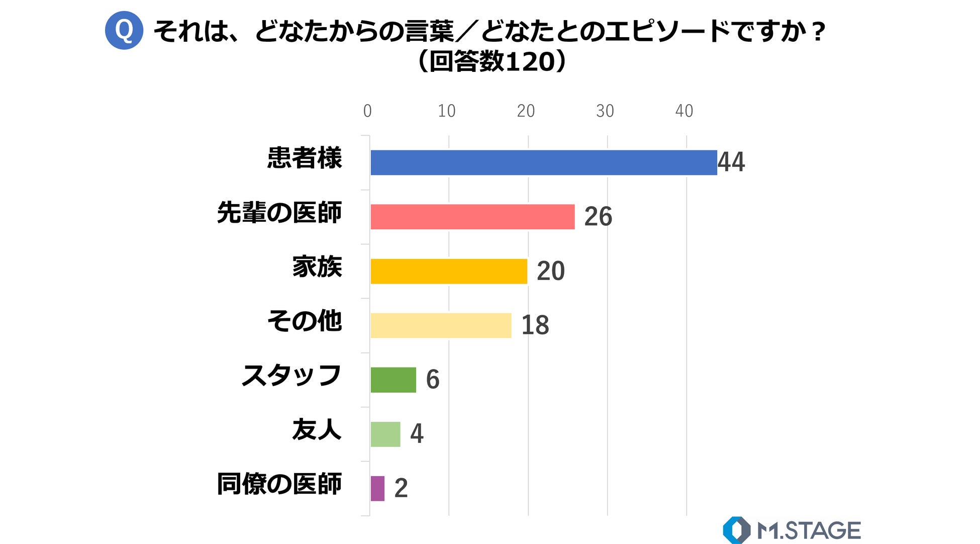 また、その言葉・エピソードの相手としては「患者様」(回答数:44)が最も多く、次いで「先輩の医師」(回答数:26)、「家族」(回答数:20)の順となりました。