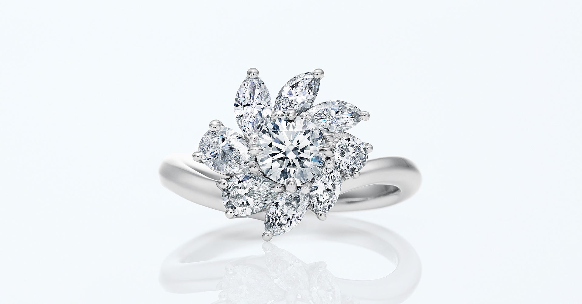 センターダイヤモンドを囲むファンシーシェイプダイヤモンドは、まるで日本舞踊の手の動きや美しい所作のような、小指から手のひらにつつみこんでゆく動きを模しています。