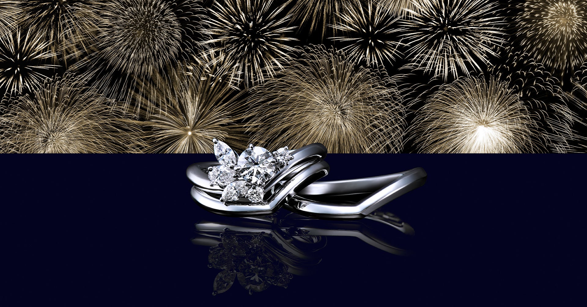 エンゲージリングは火花が舞い踊る姿を、マリッジリングは花火を写し出す水面をイメージし、動と静が対になったデザインに仕上げました。