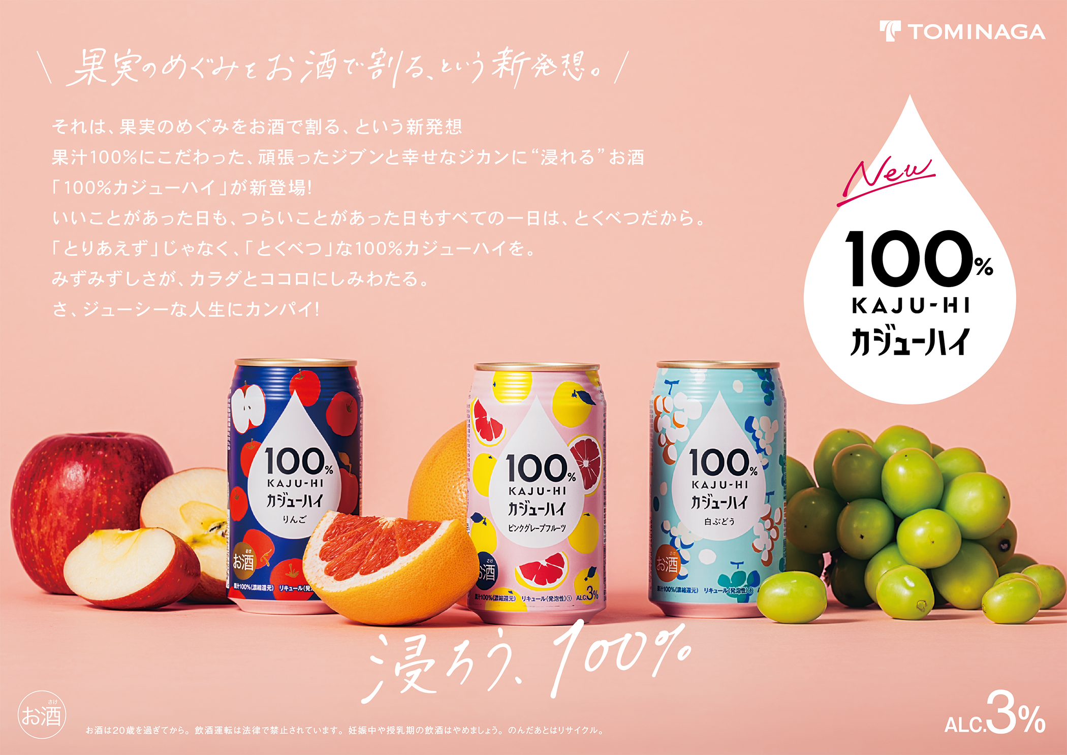 “果実のめぐみをお酒で割った”新カテゴリー「カジューハイ」登場!果汁100%にこだわった、頑張った自分と幸せな時間に“浸れる”お酒『100%カジューハイ』 3商品新発売!