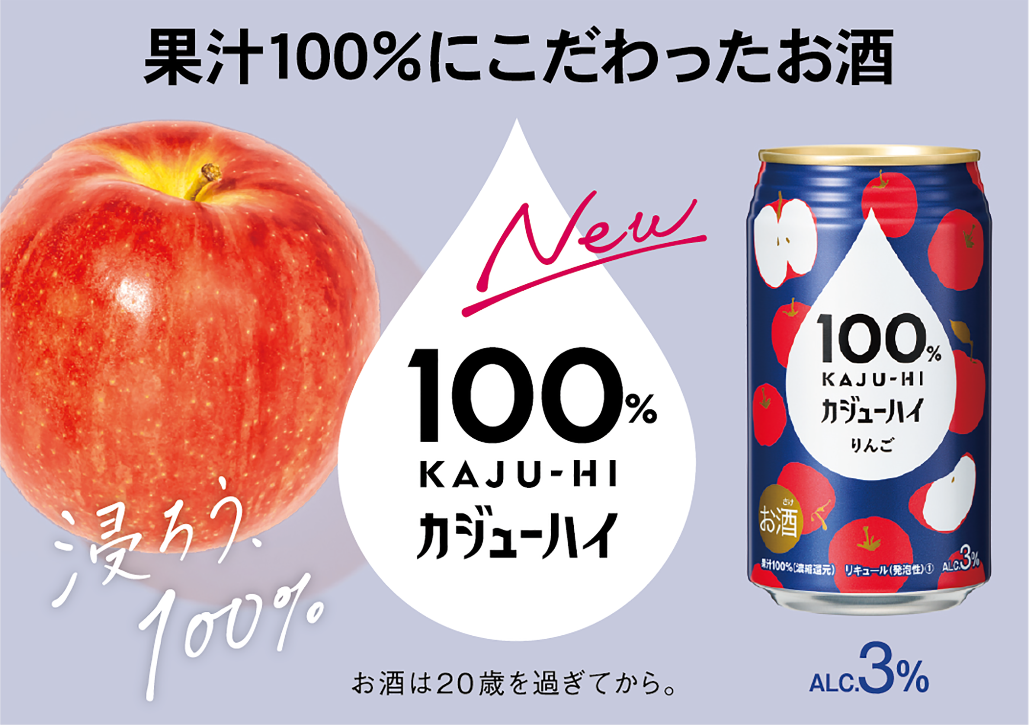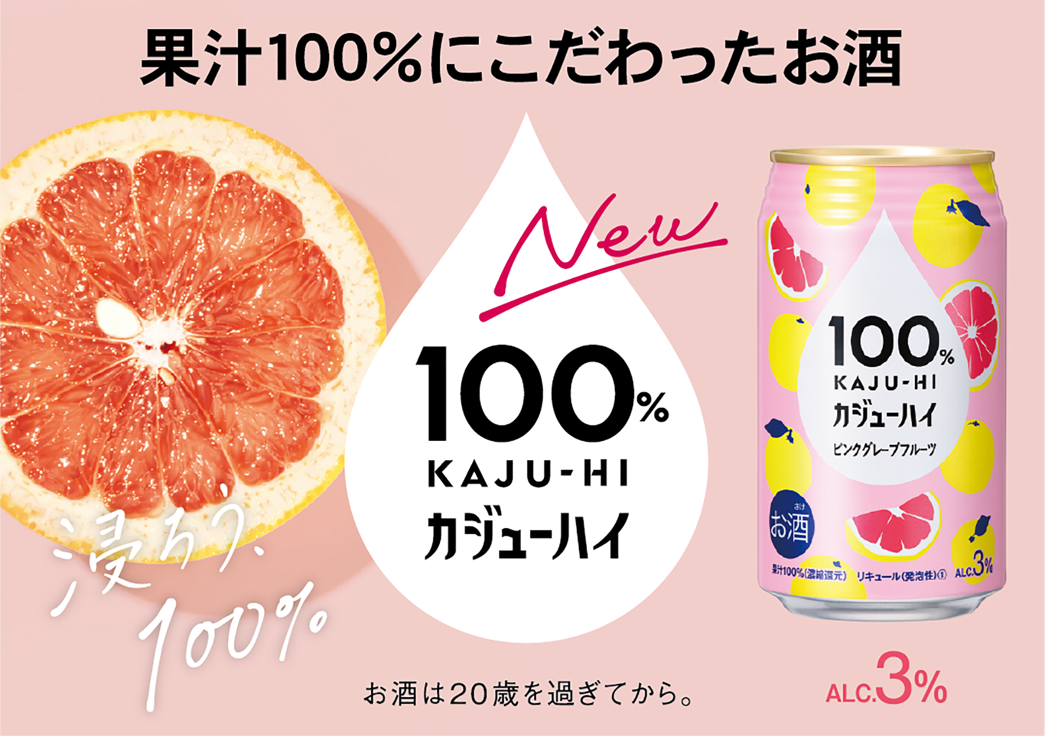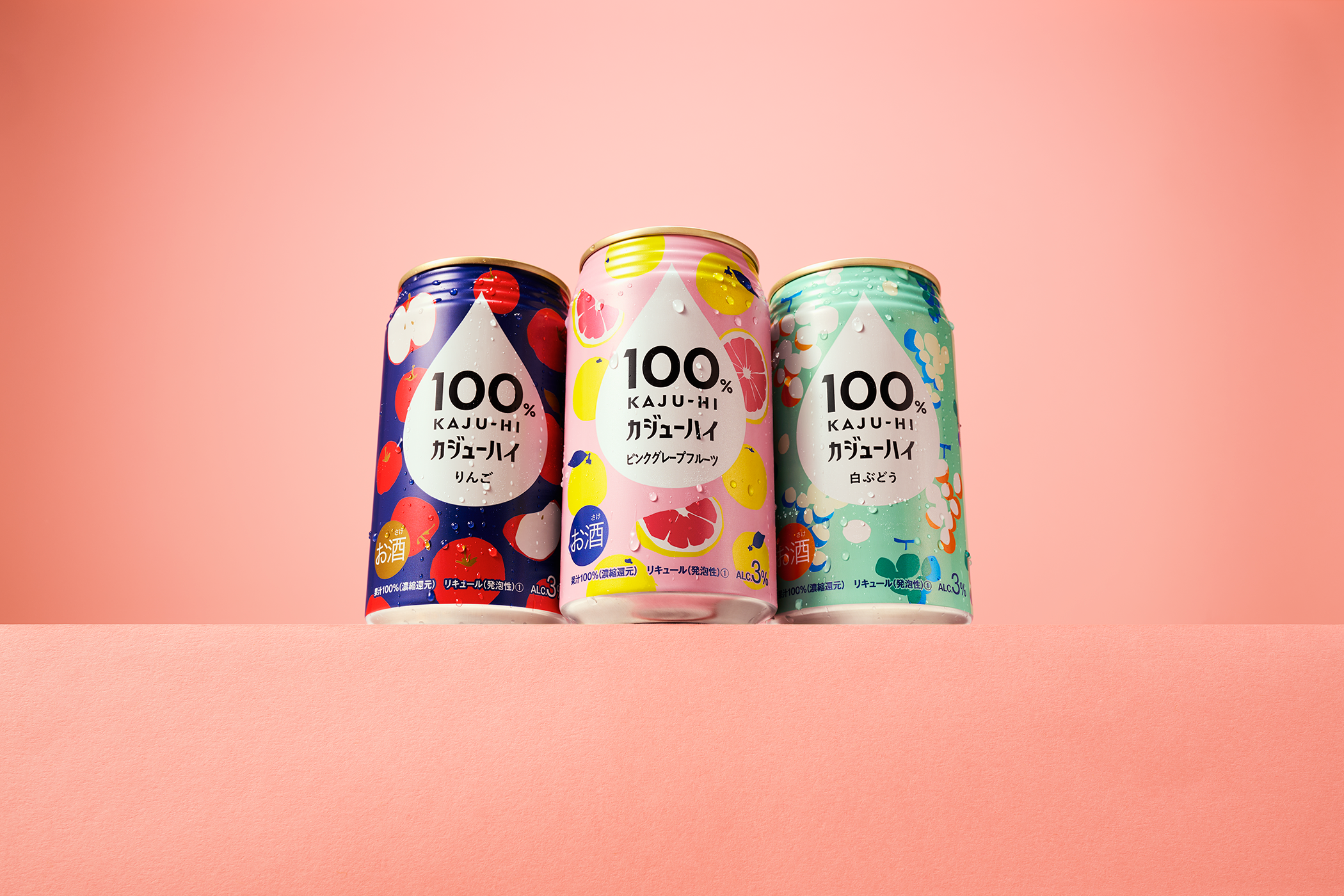『100%カジューハイ』は、“果実のめぐみ(濃縮果汁)をお酒で割る”という新発想で「カジューハイ」と名付けられた新しいカテゴリーのお酒として登場します。果汁100%だから味わえる果実本来の豊かなめぐみと、アルコール度数3%の程よいアルコール感が特徴です。酔い過ぎないから心地よくリラックスでき、果汁100%だから果実本来のおいしさが味わえる、リラックス感と贅沢さを融合させた特別なお酒です。自分の時間を自分らしく楽しむ新しいアルコールユーザーのニーズに応え開発されました。