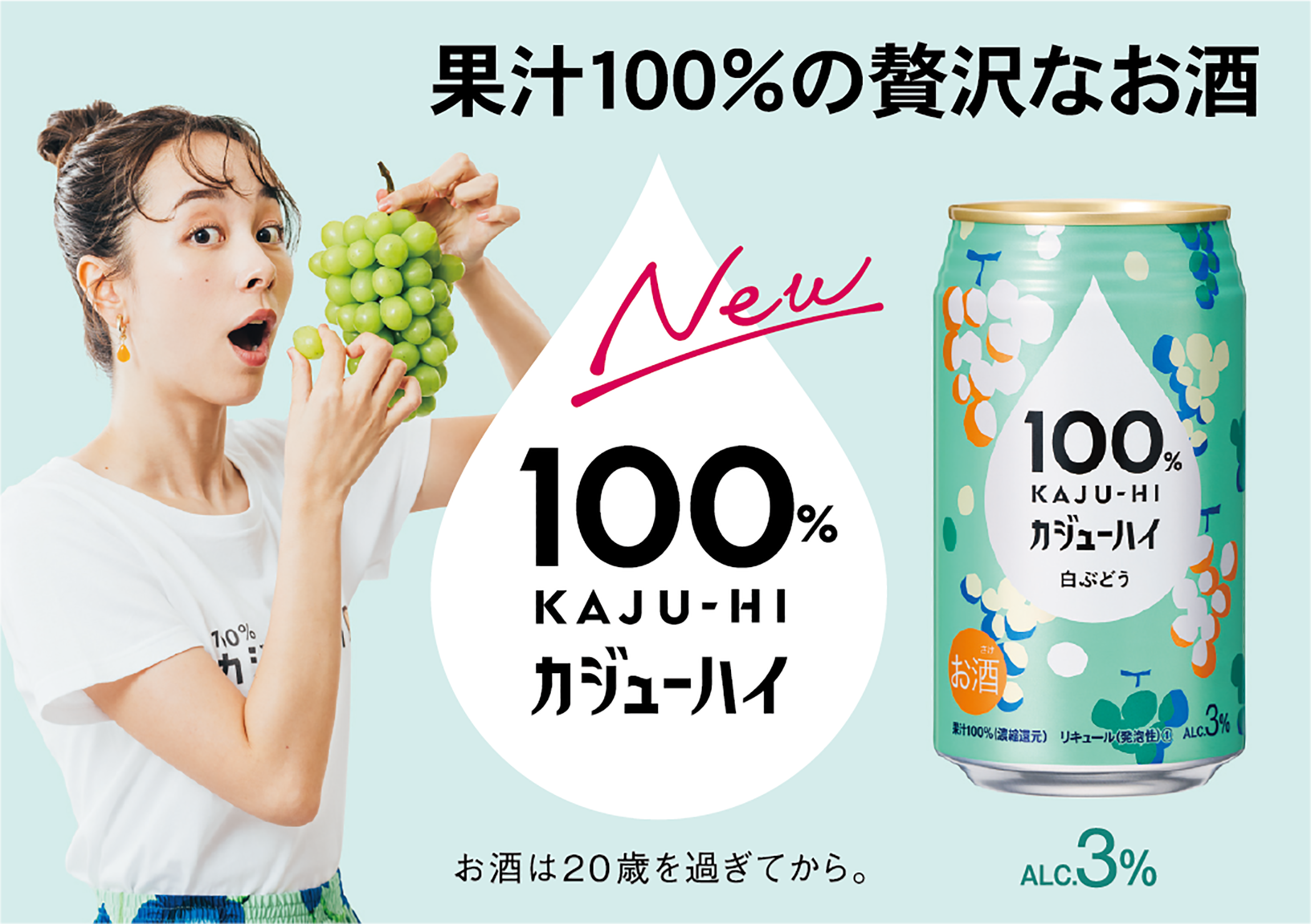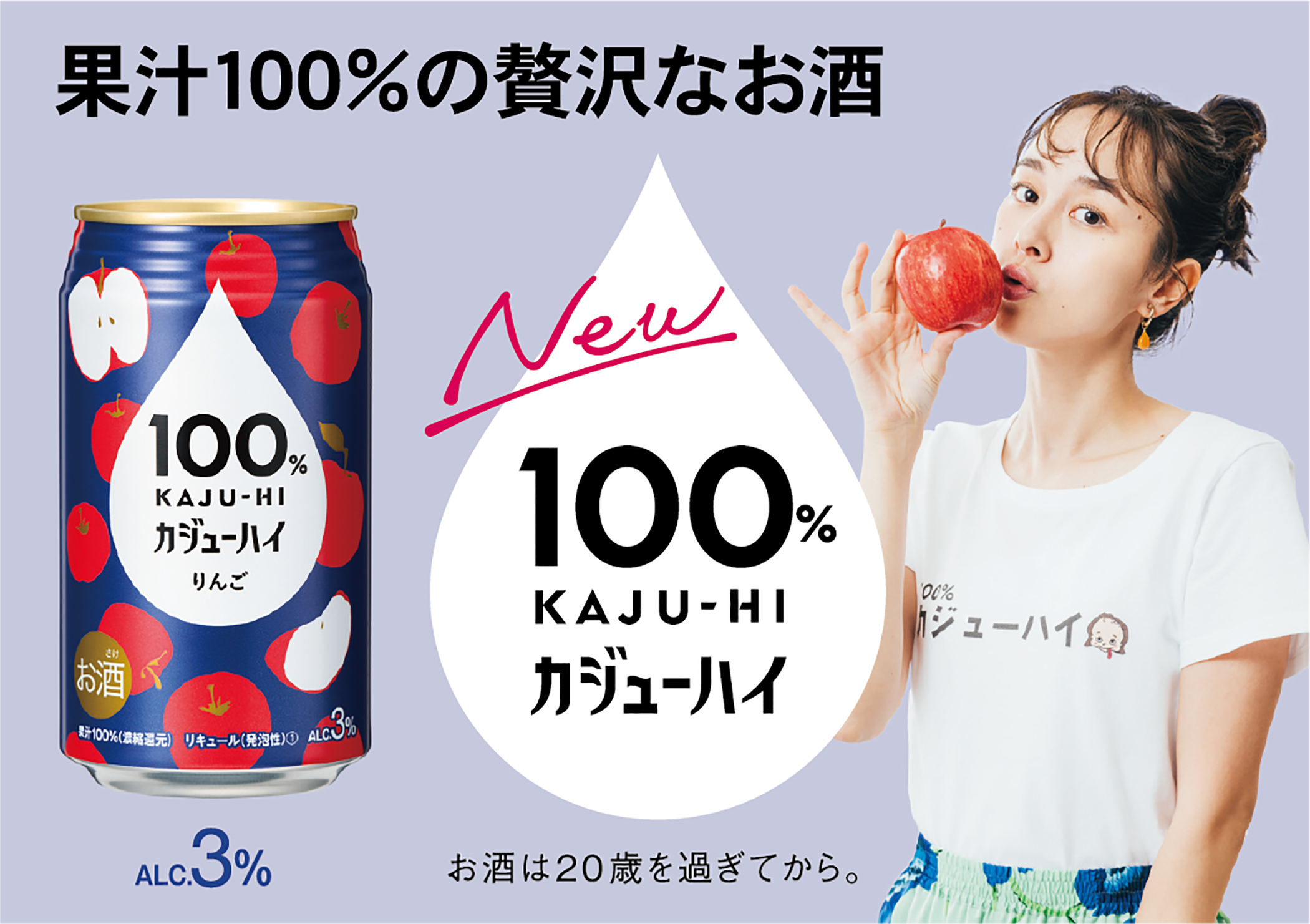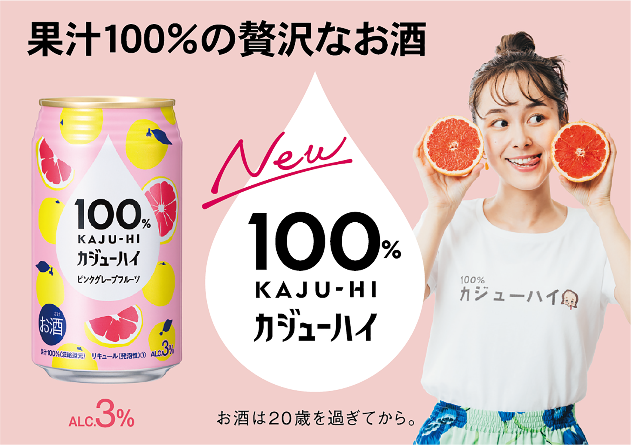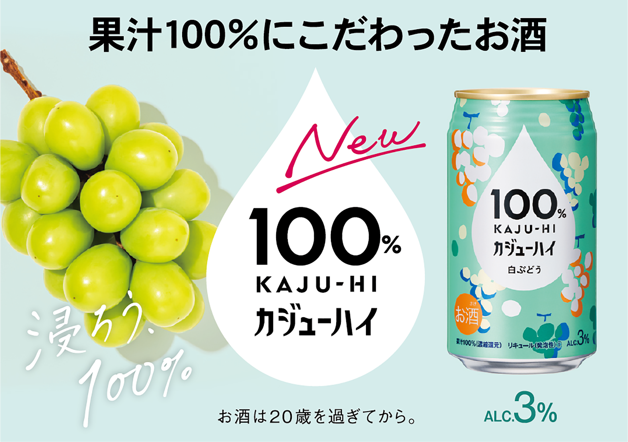 『100%カジューハイ』は、“果実のめぐみ(濃縮果汁)をお酒で割る”という新発想で「カジューハイ」と名付けられた新しいカテゴリーのお酒として登場します。果汁100%だから味わえる果実本来の豊かなめぐみと、アルコール度数3%の程よいアルコール感が特徴です。酔い過ぎないから心地よくリラックスでき、果汁100%だから果実本来のおいしさが味わえる、リラックス感と贅沢さを融合させた特別なお酒です。自分の時間を自分らしく楽しむ新しいアルコールユーザーのニーズに応え開発されました。