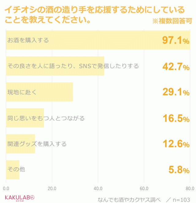 こうしたイチオシの酒の造り手を応援するために、愛飲家たちはどんなことをしているのでしょうか。推し活の内容を複数回答可で聞いてみたところ、最も多かったのは、「お酒を購入する」でなんと97%に上りました。