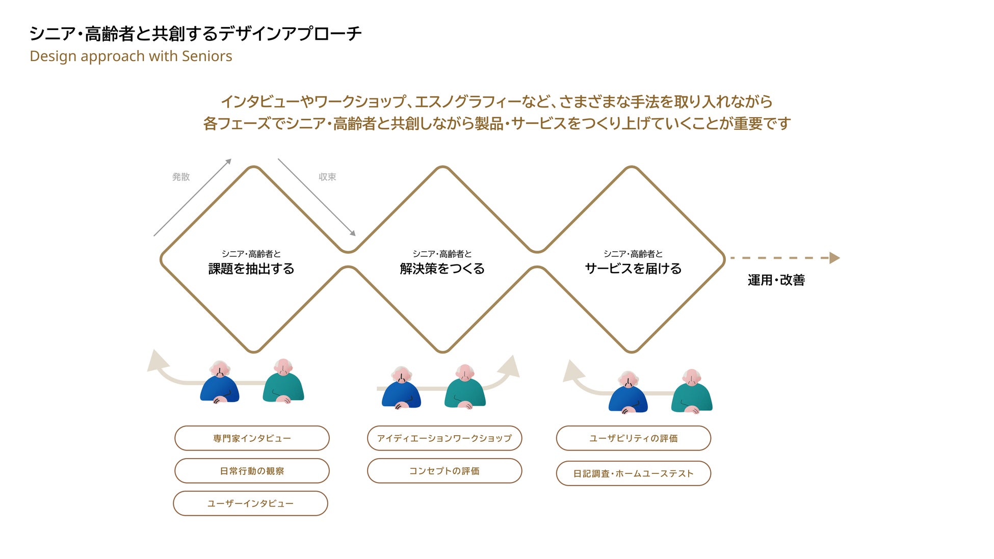 シニア・高齢者市場に適した製品やサービスを開発するためには、彼らのニーズを推測するだけでなく、実際にシニア・高齢者と共創しながら進めることが重要です。この共創プロセスでは、インタビュー、ワークショップ、エスノグラフィーなど、さまざまな手法を取り入れていきます。