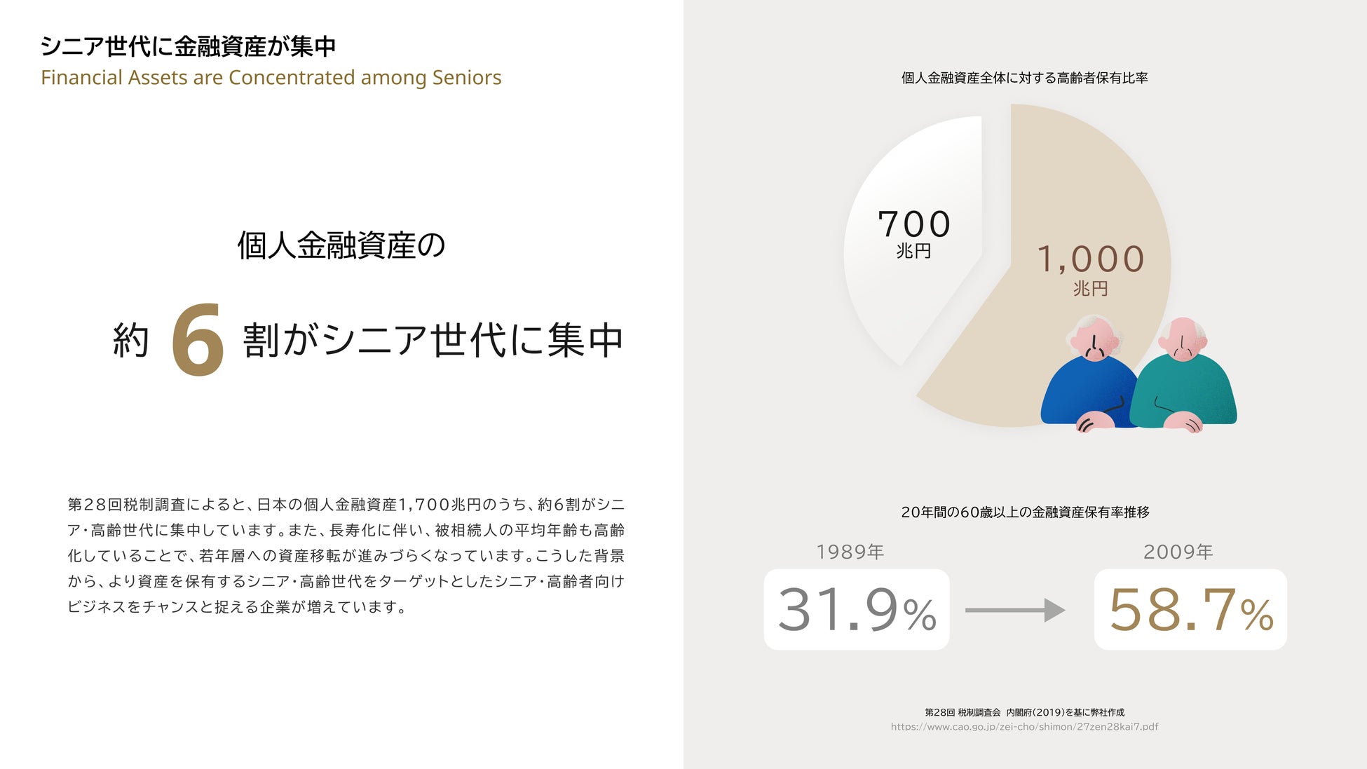 第28回税制調査によると、日本の個人金融資産1,700兆円のうち、約6割がシニア・高齢世代に集中しています。また、長寿化に伴い、被相続人の平均年齢も高齢化していることで、若年層への資産移転が進みづらくなっています。こうした背景から、より資産を保有するシニア・高齢世代をターゲットとしたシニア・高齢者向けビジネスをチャンスと捉える企業が増えています。