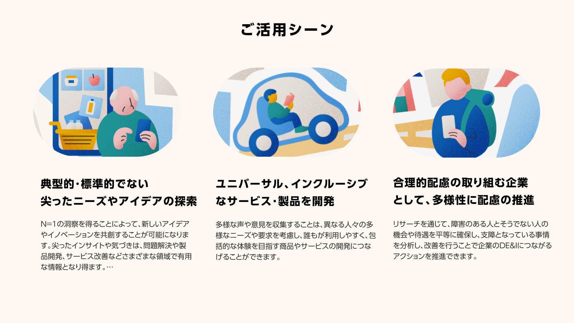 N=1に出会うための道のりが、デモグラフィック属性など、客観的に分かりやすい基本属性から選定するだけでなく、目に見えない多種多様な特性(特別な経験・障害・社会課題の取り組み)から調査対象候補者に出会うことができます。