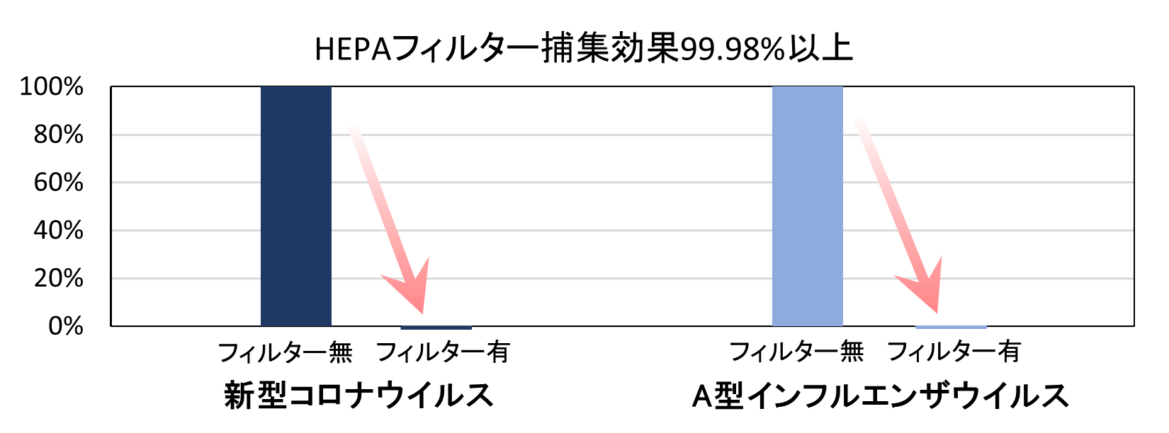 ※A: 一定の試験条件下におけるHEPAフィルター濾材の捕集効果を示しており、空間における捕集効果を示すものではありません。また、HEPAフィルターは、ウイルスの働きを抑制することや、病気の治療や予防を目的とするものではありません。