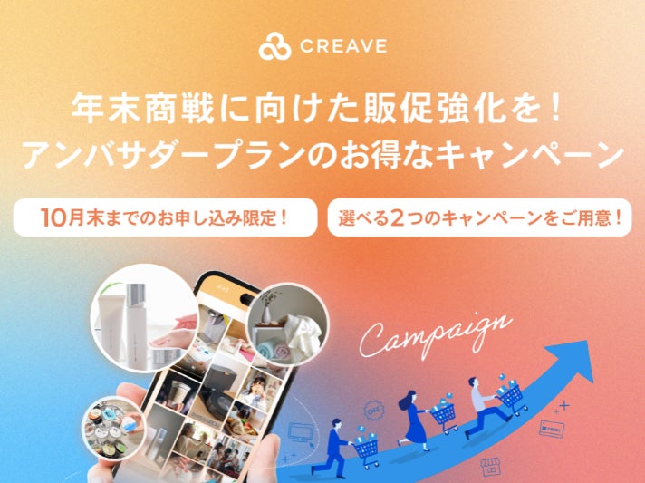 CREAVEでは、SNSに関するソリューションを豊富にご用意しております。今回、2024年10月末までの期間限定で、SNSでのブースト&ECサイト集客に貢献する「アンバサダープラン」のお得なキャンペーンを開催中です。ぜひこの機会にご検討ください。