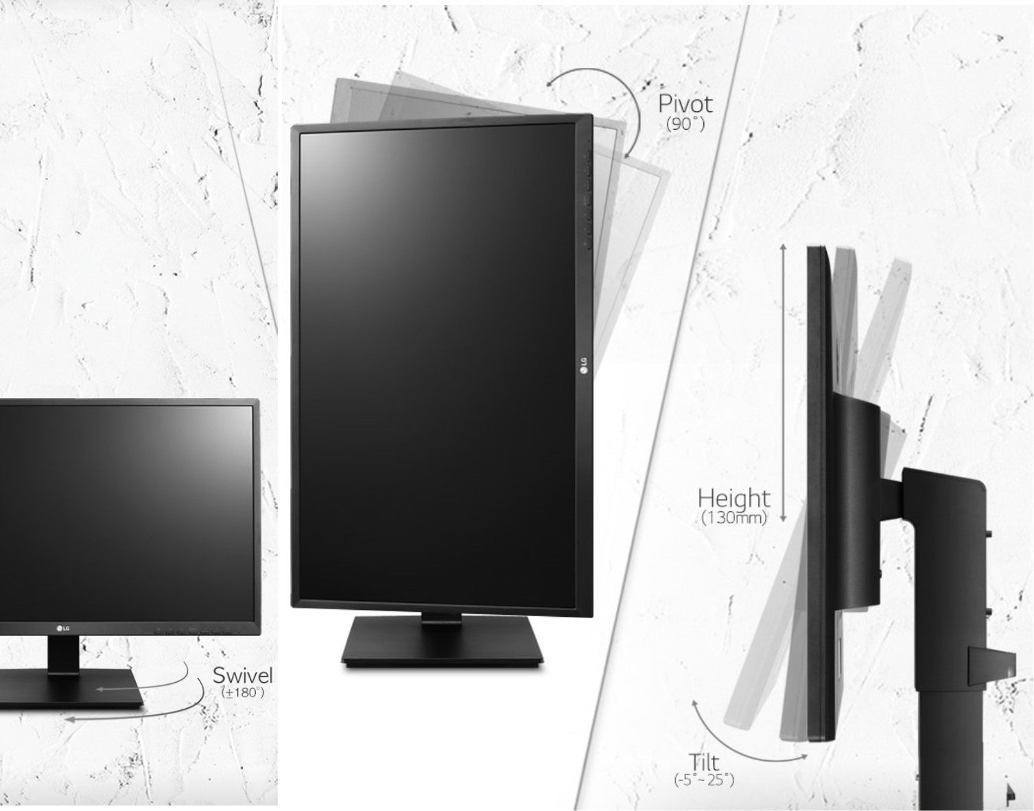 今回の2モデルは、エルゴノミックデザインによって快適な画面配置を実現する、ビジネスにもプライベートにも使用しやすいモニターです。組み立てはとても簡単。スタンドを組み立ててモニターの背面にカチっとはめるだけ。130mmの高さ調整、355゚のスイベル、前:-5゚~後:35゚のチルト、ピボットに対応。姿勢や使用環境に合わせて画面の配置が可能です。