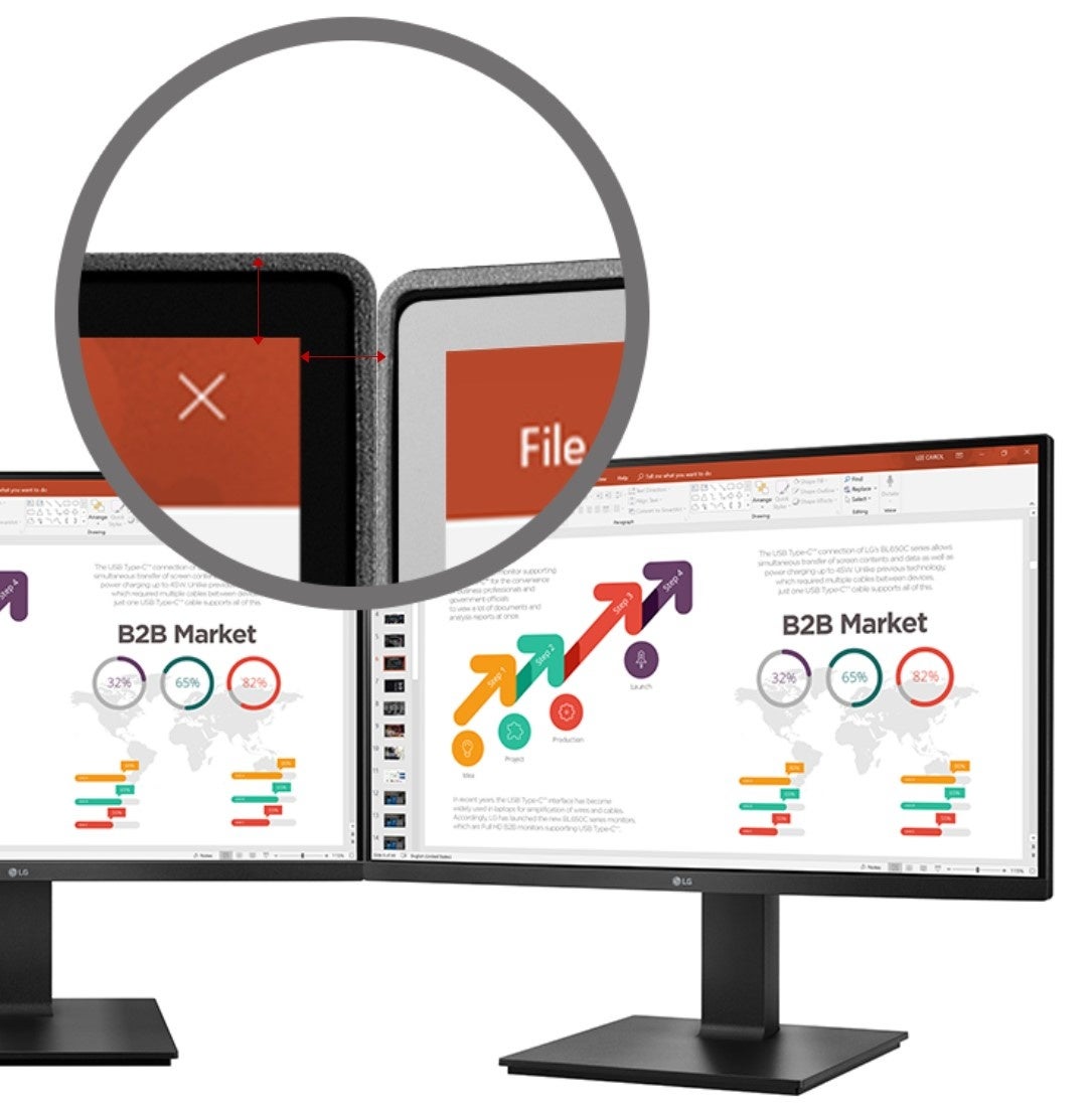 さらに、3辺フレームレスデザイン採用で、2台設置のデュアルモニターでも継ぎ目の少ない画面環境を作ることができます。ベゼルは2mm以下で、非表示領域をあわせても7mm以下の薄型ベゼルデザインを採用。コンパクトボディなので従来よりも省スペースで設置できます。