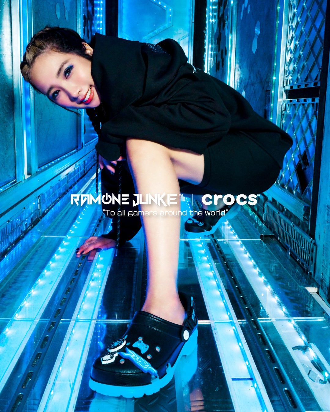 初のコラボレーション商品となるRAMUNE JUNKIE All-Terrain Clogは、デジタル空間を彷彿させるブラックとライトブルーのコントラストデザイン要素をAll-Terrain Clogに落とし込むとともに、ゲームプレイヤーのパフォーマンスを引き出すサポーティング・ギアとしてAll-Terrain Clogが本来持つ快適性とファッション性を両立させたコラボレーションモデルです。