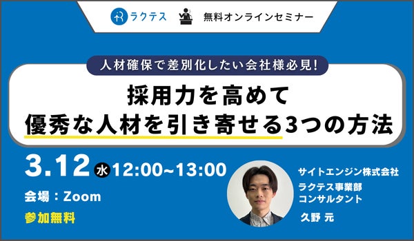 クラウドでの試験運用システム「ラクテス(https://rakutesu.com/)」を運用するサイトエンジン株式会社(本社:東京都世田谷区 代表取締役:毛塚智彦)は、2025年3月12日(水)12:00~13:00に、“ 【人材確保で差別化したい会社様必見!】採用力を高めて優秀な人材を引き寄せる3つの方法” を開催します。