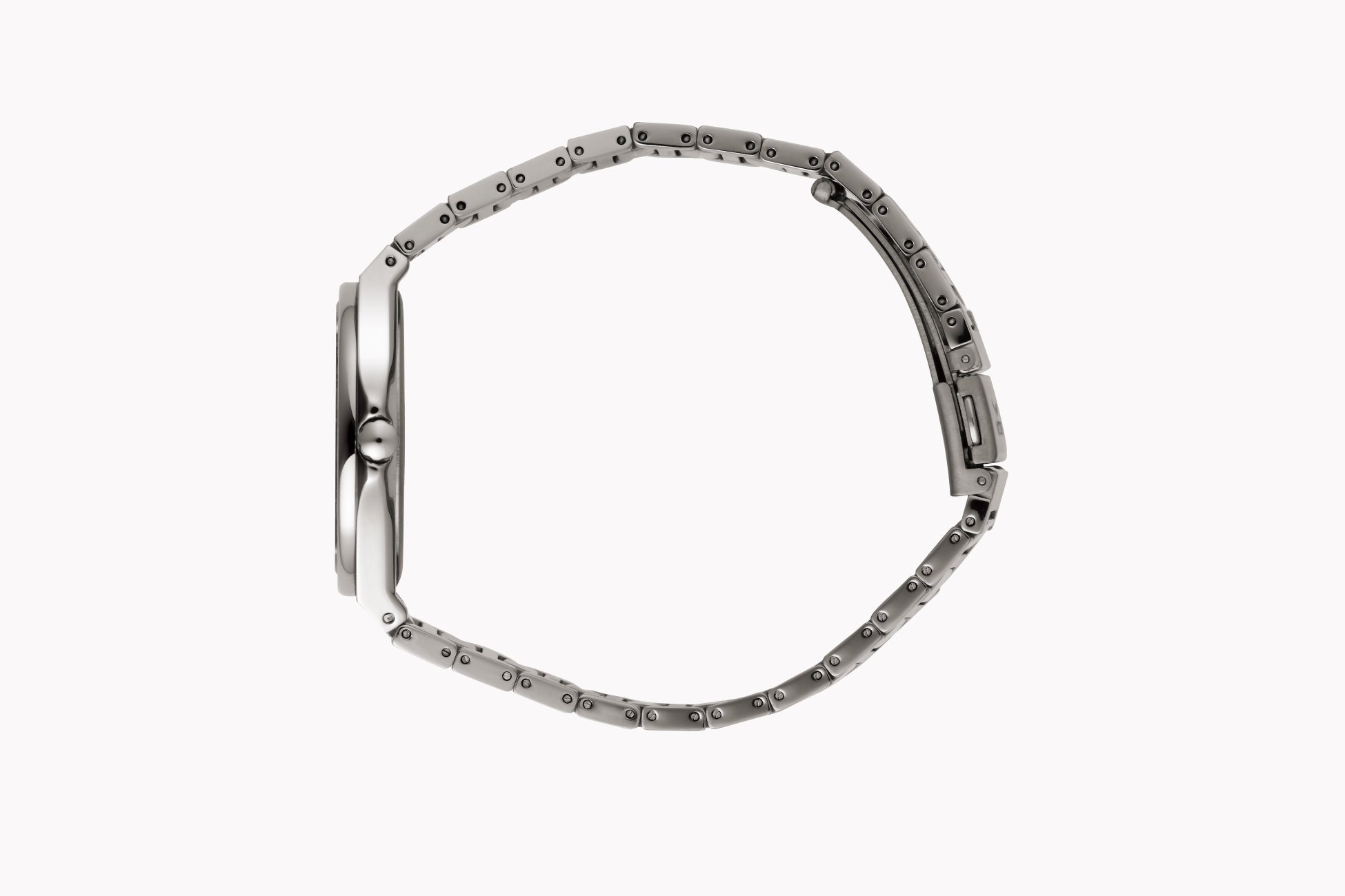 存在感のあるクッション型のダイアルはワッフルタイプに仕上げ、シャープなバーインデックスと相まってスタイリッシュなデザインに仕上がっています。厚さ7mm・重さ67gと身に着けていることを忘れるほどの着け心地の良さを実現。ムーブメントは日本製、風防にはサファイアクリスタルを採用しています。