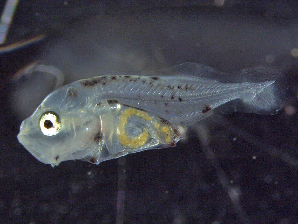 孵化直後から全長5mm程度までは半透明の体色をしていますが、全長6mm程度に達すると体の大半部分は黒褐色となる他、鰓蓋棘(さいがいきょく)が著しく発達することが確認されました。