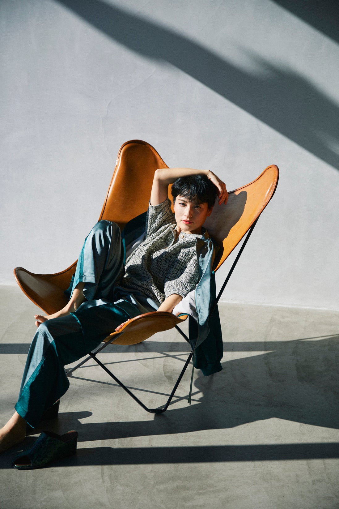 ご自宅でお洗濯できる天然素材と、柔らかなタッチのサテン系生地をミックスしたスタイリングもおすすめです。