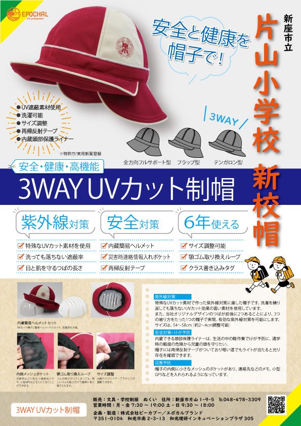 株式会社ピーカブー(本社:埼玉県和光市南2-3-13 和光理研インキュベーション)は、2025年4月より、埼玉県新座市立片山小学校(戸髙正弘 校長)において、同校の創立150周年を記念した特別仕様の「エポカル 3WAY&マルチガード通学帽」の導入が決定したことをお知らせいたします。