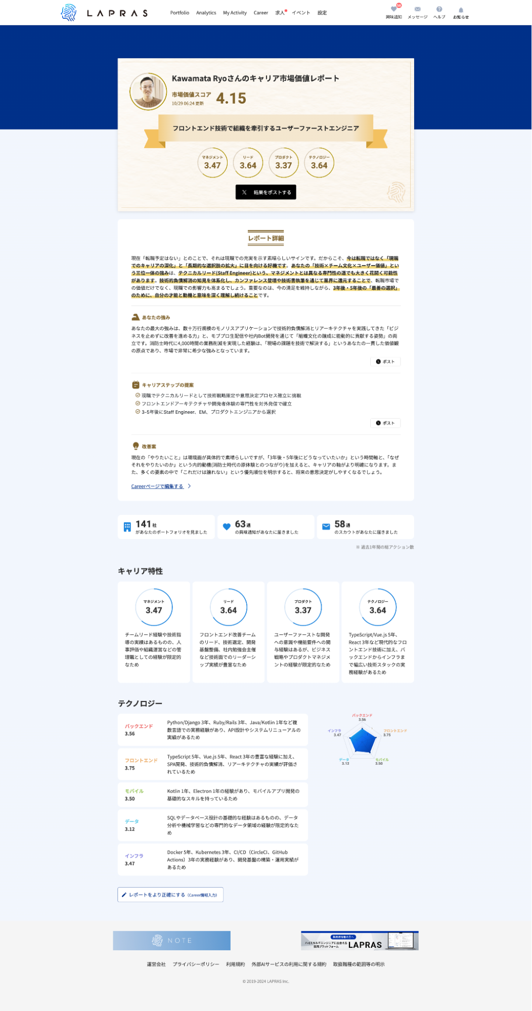 LAPRASは、エンジニアが自身の能力を最大限に発揮し、納得のいくキャリアを歩める社会を目指しています。今後も「キャリア市場価値レポート」をはじめとする各機能の改善を続け、一人ひとりのキャリア形成に寄り添うパートナーを目指してまいります。